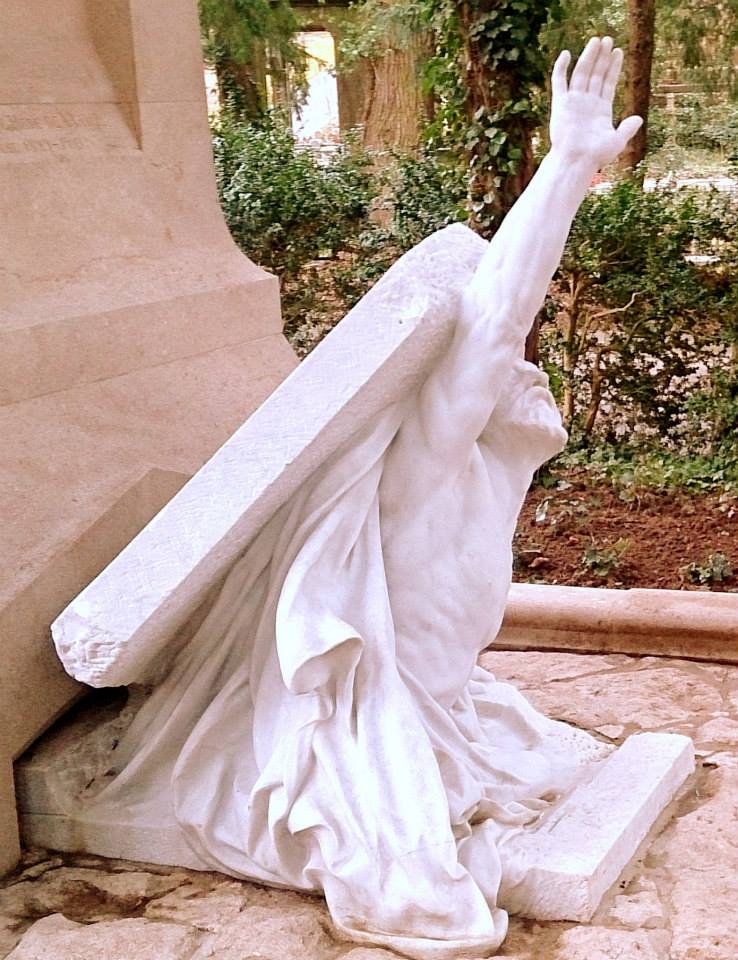 La sépulture de Jules Verne a été réalisée d’après le masque mortuaire de l’écrivain, deux ans après sa mort, par Albert Roze. Jules Verne soulève la pierre tombale, sortant de son exil mortuaire, il s’élève vers ce ciel où règnent les plus légers que l’air. L’œuvre s’intitule Vers l’immortalité et l’éternelle jeunesse.